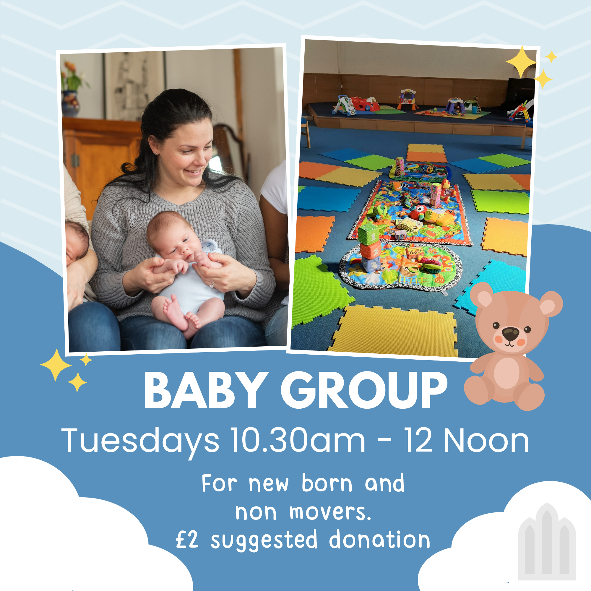 Tuesday mornings is a small friendly group for babies and non-movers. Meet others and enjoy the atmosphere. No need to book.