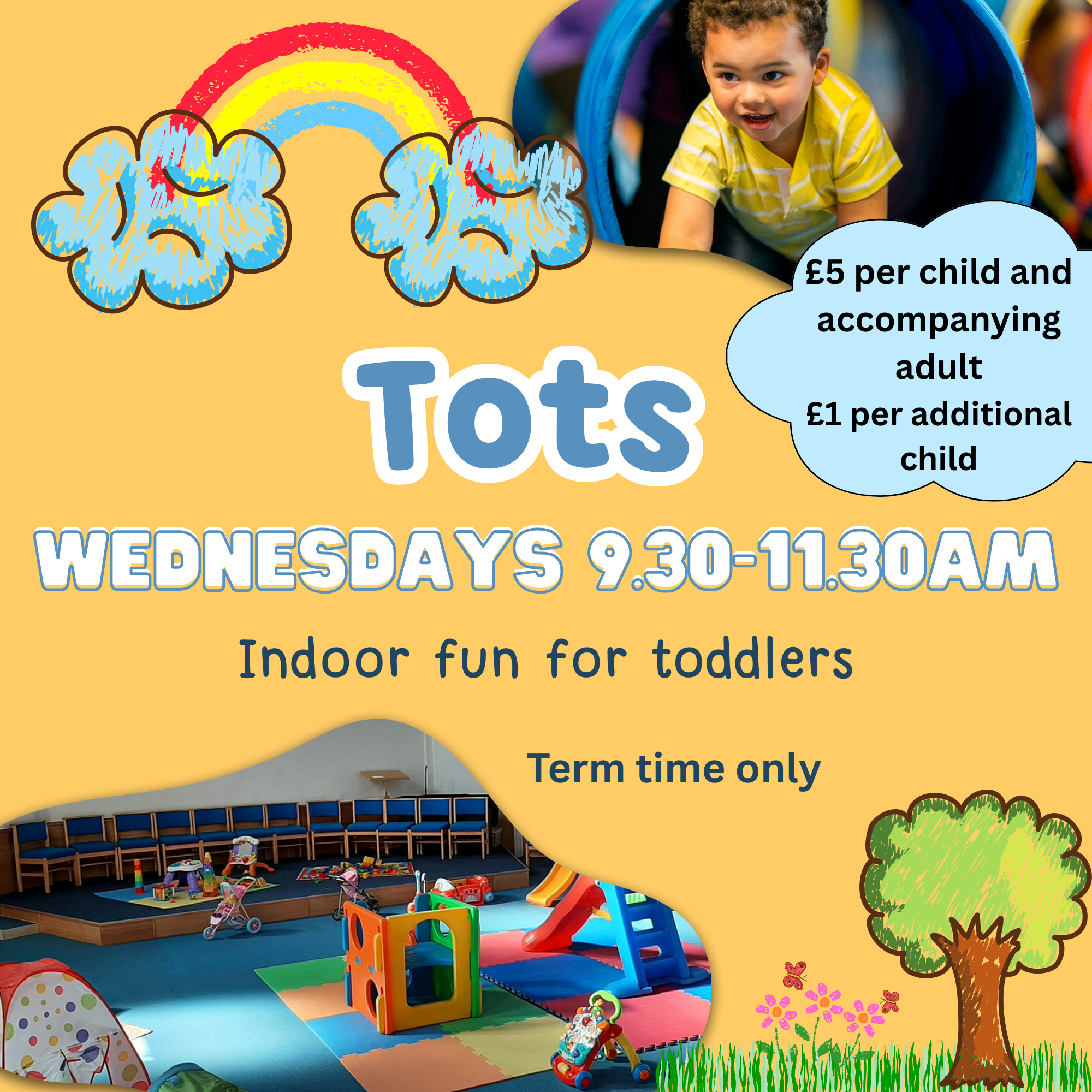 Tots meet during term-time every Wednesday 9.30-11.30am for toddler play and crafts.
